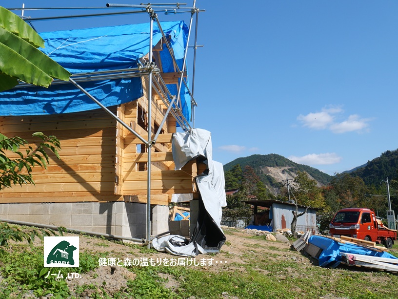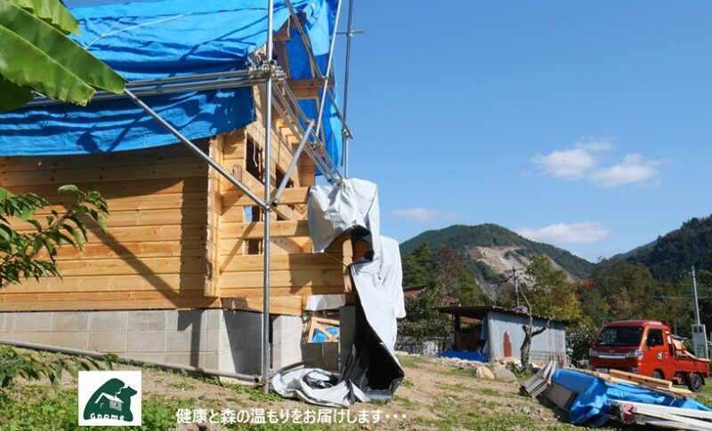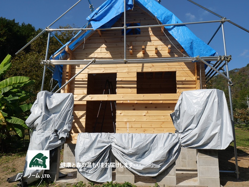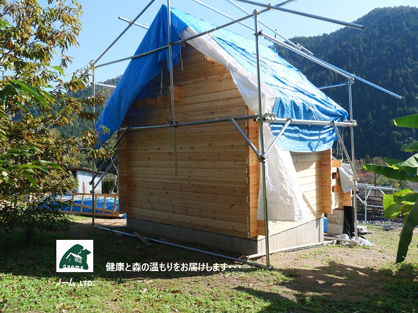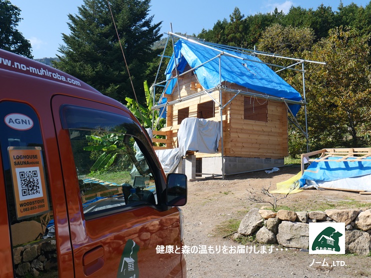先日お便りをいただいた広島市佐伯区の農園丘陵地に6畳+ロフト付きログハウス ☚ のセルフビルドが進むお客様の現地をアフター訪問しました。 農園の収穫作業と並行して着々と進んでいます。