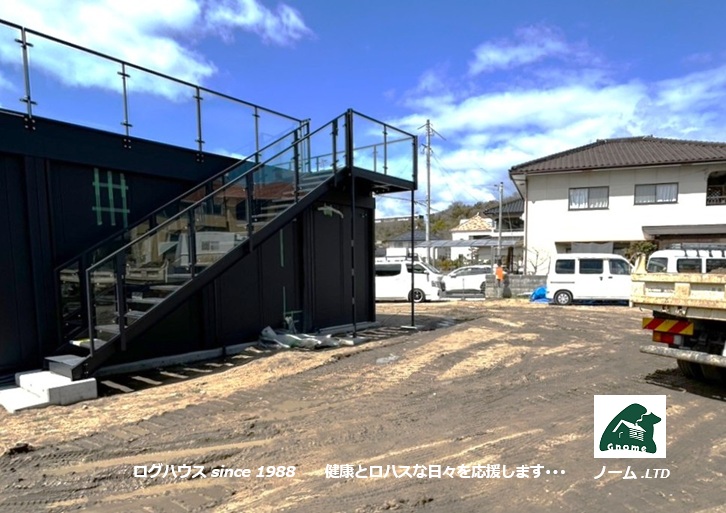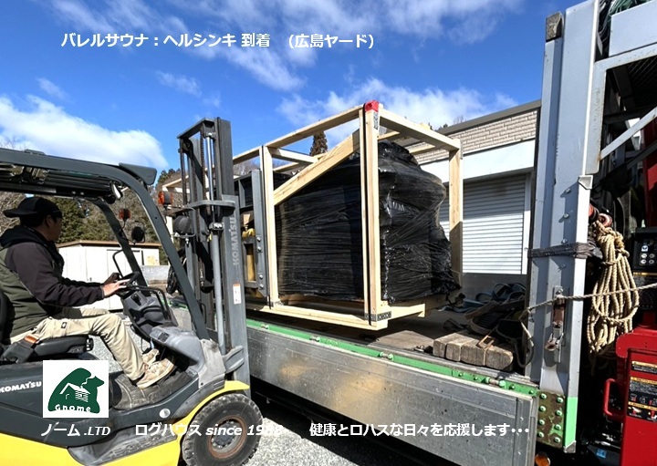 広島県三原市の某施設に搬入する サウナ小屋:ヘルシンキ ☚ が到着し組立をスタートしました。