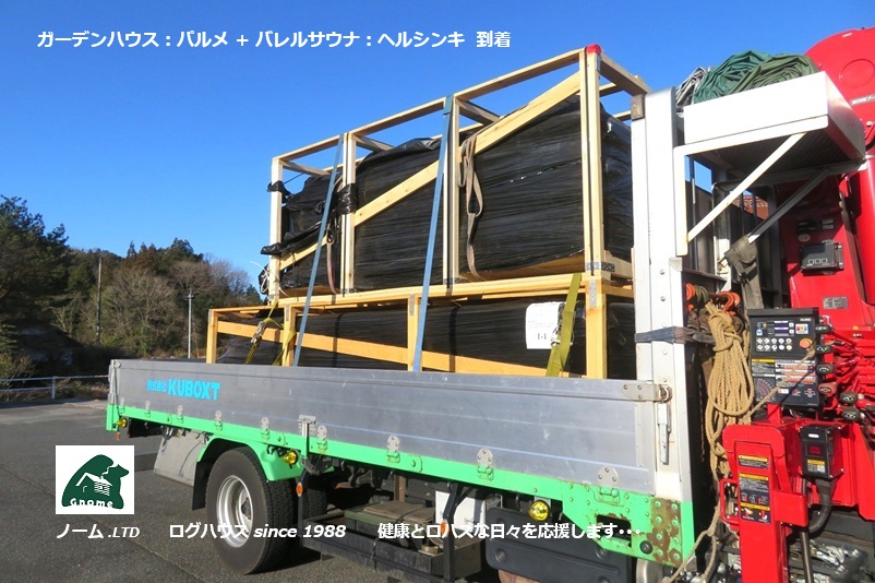 バレルサウナ:ヘルシンキ と ガーデンハウス:パルメ の2棟が同時到着。