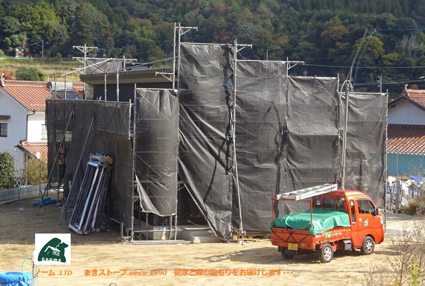 薪ストーブ設置に助成金が交付されている広島県東広島市にてマイホームのご新築工事が進むお宅に